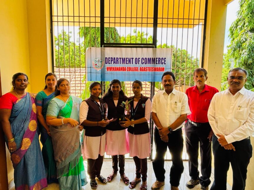 அகஸ்தீஸ்வரம் விவேகானந்தா கல்லூரியில் வணிகவியல் துறை சார்பில் துறை முதலாம் ஆண்டு மாணவர்களை வரவேற்கும் நிகழ்வு நடந்தது. நிகழ்வுக்கு வணிகவியல் துறை தலைவர் முனைவர் ஆர். தர்மரஜினி தலைமை தாங்கினார். கல்லூரி முதல்வர் முனைவர் டி.சி. மகேஷ் சிறப்பு விருந்தினராக கலந்து கொண்டார். துறை பேராசிரியர்கள் ராஜபிரியா, முருக பூபதி, ஜெயபிரபா, ஜானகி ஆகியோர் முன்னிலை வகித்தனர். முதலாம் ஆண்டு மாணவ மாணவிகளுக்கு மூன்றாம் ஆண்டு மற்றும் இரண்டாம் ஆண்டு மாணவ மாணவிகள் தேக்கு மரக்கன்றுகள், வாழ்த்து அட்டை மற்றும் இனிப்பு கொடுத்து வரவேற்றனர். மாணவர்களிடையே ஒற்றுமையையும், இயற்கை பாதுகாப்பு விழிப்புணர்வும், சமூக ஒற்றுமையும், இளைஞர் மேம்பாட்டையும் வலியுறுத்தும் விதமாக இந்த நிகழ்வு ஏற்பாடு செய்யப்பட்டிருந்தது.