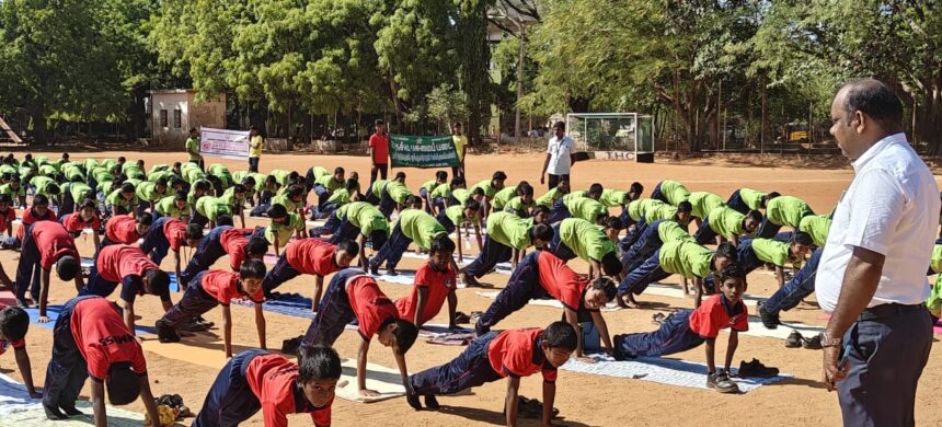 அமைதி, அன்பு, அரவணைப்பு, சகோதரத்துவத்தை முன்னிறுத்தி உலக யோகா தினத்தில் மதுரை முத்து தேவர் முக்குலத்தோர் பள்ளி மாணவர்கள்