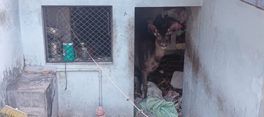 அருமனை அருகே கடையால் பகுதியை சேர்ந்தவர் இப்ராஹிம் என்பவரது வீட்டு சமையலறை அருகே விறகுகளை போட ஒரு அறை உள்ளது. இன்று காலை மிளா ஒன்று அந்த அறையில் புகுந்தது. உடனடியாக இப்ராஹிம் களியல் வனச்சரக அலுவலகத்தில் புகார் தெரிவித்தார். வனச்சரக அலுவலர் முகைதின் தலைமையில் வன ஊழியர்கள் உடனடியாக சம்பவ இடத்திற்கு விரைந்து சென்றனர். அங்கு பார்த்த போது சுமார் 200 கிலோ எடையுடைய 3 வயதான பெண் மீளா ஒன்று மிரட்சியுடன் நின்றது கண்டனர். காட்டில் இருந்து செந்நாய்கள் துரத்தியதால் மிளாவின் கழுத்து பகுதியில் காயம் ஏற்பட்டிருந்தது. சுமார் 2 மணி நேர போராட்டத்திற்கு பிறகு மிளாவை வலை மூலம் பிடித்து பின்னர் அடர்ந்த வனப்பகுதியான குந்திரிகம்காடு என்ற பகுதியில் மிளவை கொண்டு விட்டனர்.