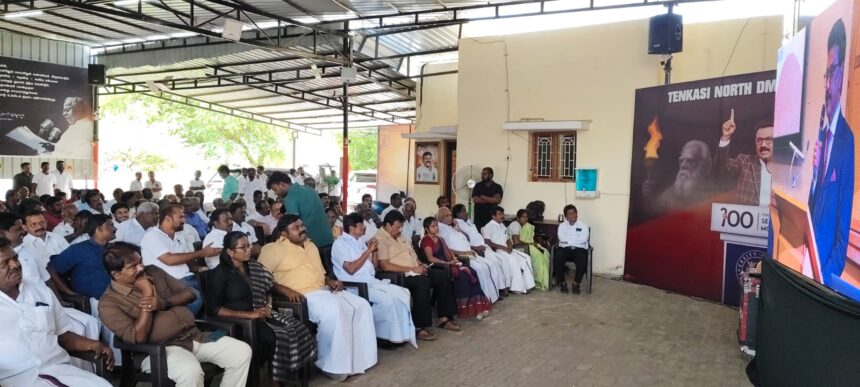 தமிழ்நாடு முதலமைச்சர் கடந்த 4-ம் தேதி மாலை ஆக்ஸ்போர்டு பல்கலைக்கழகத்தில் பெரியார் உருவப்படத்தை திறந்து வைத்து ‘சுயமரியாதை இயக்கம் மற்றும் அதன் மரபுகள்’ குறித்து மாநாட்டில் பேசிய இந்த வரலாற்று சிறப்புமிக்க நிகழ்வை பொதுமக்கள் மற்றும் கட்சி தொண்டர்களும் கண்டுகளிக்கும் வகையில் தென்காசி வடக்கு மாவட்ட தி.மு.க அலுவலகத்தில் பெரிய அளவிலான எல்.இ.டி திரைகளை அமைத்து நேற்று காலை ஒளிபரப்பு செய்யப்பட்டது.