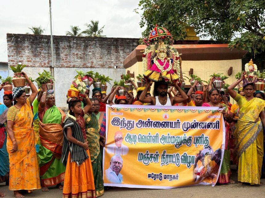 ஈரோடு மாநகர் மாவட்ட இந்து அன்னையர் முன்னணி சார்பாக ஆடி வெள்ளிக்கிழமையையொட்டி வைராபாளையம் வாய்க்காலில் இருந்து தீர்த்தம் எடுத்து தாரை தப்பட்டை உடன் பெண்கள் ஊர்வலமாக வந்தனர். இதன் அசோகபுரம் விளையாட்டு மாரியம்மனுக்கு புனித மஞ்சள் நீர் ஊற்றி அபிஷேகம் செய்தனர்.