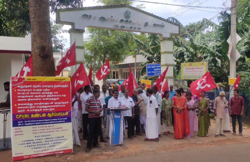 குமரி மாவட்டம் ஆறுதேசம் ஆரம்ப சுகாதார நிலையத்தில் புதிய கட்டிடங்கள் கட்ட தேசிய சுகாதார முகமை நிதியிலிருந்து ஒரு கோடியே 10 லட்சம் ரூபாய் நிதி ஒதுக்கீடு செய்யப்பட்டு புதிய கட்டுமான பணிகள் நிறைவடைந்தது. பல மாதங்கள் கடந்த பின்பும் பொதுமக்கள் பயன்பாட்டிற்கு கட்டிடங்கள் திறக்கப்படாமல் உள்ளது. எனவே புதிய கட்டிடங்களை திறக்க கேட்டும் கூடுதல் மருத்துவர்கள் மற்றும் செவிலியர்களை நியமித்து அனைத்து வசதிகளும் கூடிய முழு நேர மருத்துவமனையாக தரம் உயர்த்த வேண்டும். கூடுதல் மருத்துவ பணியாளர்களை நியமிக்க வேண்டும் என்ற கோரிக்கைகளை வலியுறுத்தி மார்க்சிஸ்ட் கம்யூனிஸ்ட் கட்சியின் மெது கும்மல் வட்டார குழு சார்பில் ஆரம்ப சுகாதார நிலையம் முன்பு கண்டன ஆர்ப்பாட்டம் நடைபெற்றது. மங்காடு ஊராட்சி முன்னாள் தலைவர் சுரேஷ்குமார் தலைமை வகித்தார். கட்சியின் மாவட்ட செயலாளர் செல்வசாமி ஆர்ப்பாட்டத்தை துவக்கி வைத்து பேசினார் மற்றும் வட்டார செயலாளர் தங்கமணி, மாவட்ட செயற்குழு உறுப்பினர் ராஜேஷ், லாரன்ஸ், முன்னாள் மங்காடு ஊராட்சி தலைவர் ரீனா உட்பட பலர் கலந்து கொண்டனர்.