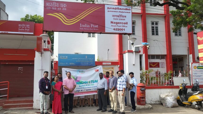 இந்திய தபால் துறை சார்பில் ஒவ்வொரு ஆண்டும் செப்டம்பர் மாதம் 17-ந்தேதி முதல் தூய்மையே சேவை திட்டத்தின் கீழ் பல்வேறு நிகழ்ச்சிகள் நடத்தப்படுகின்றது. அதன் தொடர்ச்சியாக தபால் துறை சார்பில் தபால் துறை ஊழியர்கள், பொதுமக்களுடன் இணைந்து தூய்மை பணியில் ஈடுபட்டு வருகின்றனர். இதையொட்டி இன்று கன்னியாகுமரி அஞ்சல் கோட்ட கண்காணிப்பாளர் க. செந்தில்குமார் தலைமையில் நாகர்கோவில் தலைமை தபால் நிலையத்திற்கு முன்பாக நாகர்கோவில் எஸ் டி இந்து கல்லூரியின் என்எஸ்எஸ் ஒருங்கிணைப்பாளர் முனைவர் தாணம்மாள் மற்றும் மாணவ, மாணவியர்கள் தூய்மை சம்பந்தமாக விழிப்புணர்வு தெருமுனைப் பிரச்சாரம் நடத்தினர். நிகழ்ச்சியில் அஞ்சலக ஊழியர்கள், கல்லூரி மாணவ மாணவியர்கள், பொதுமக்கள் பலர் கலந்து கொண்டனர்.