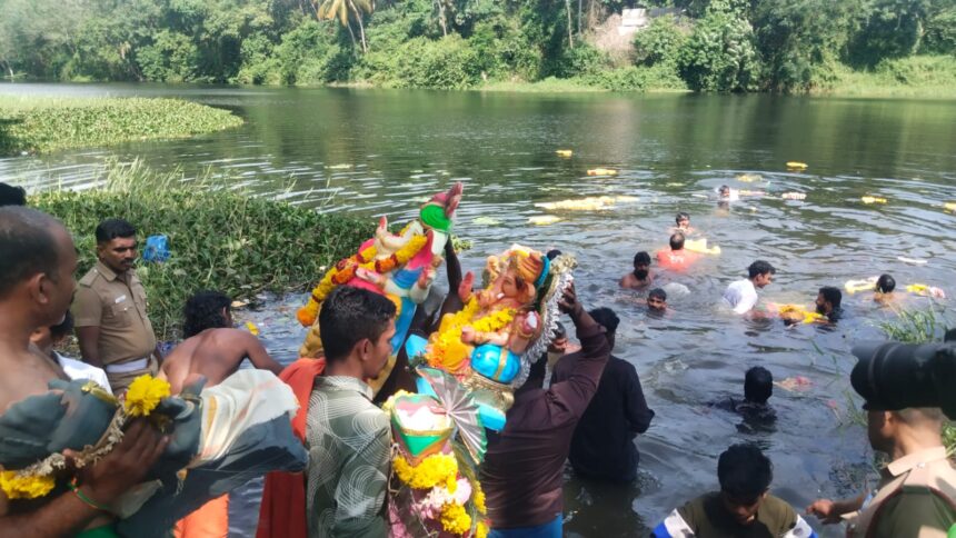 குழித்துறை நகர இந்து முன்னணி சார்பில் மார்த்தாண்டம் பம்மத்திலிருந்து விநாயகர் விசார்ஜன ஊர்வலம் துவங்கி வெட்டுவெந்நி குழித்துறை ஜங்ஷன் வழியாக தாமிரபரணி ஆறு வந்தடைந்தது.