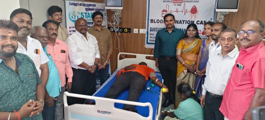 திண்டுக்கல் – திருச்சி சாலையில் உள்ள ஸ்டார் கிட்ஸ் மருத்துவமனையில் இரத்தக் கொடையாளர் தினத்தை முன்னிட்டு ரத்த தான முகாம் நடைபெற்றது. குழந்தைகள் நல சிறப்பு மருத்துவர் குணசேகரன் முகாமை துவங்கி வைத்தார். விழாவில் பொதுமக்கள், மருத்துவமனை ஊழியர்கள் மற்றும் காஸ்மாஸ் லயன் சங்கத்தைச் சேர்ந்த உறுப்பினர்கள் 50க்கும் மேற்பட்டோர் விபத்து மற்றும் பல்வேறு அறுவை சிகிச்சைகளுக்காகக் கஷ்டப்பட்டுக் கொண்டிருக்கும் உயிர்களைக் காப்பாற்றுவதற்காக முகாமில் கலந்து கொண்டு இரத்த தானம் வழங்கினர். இதற்கான ஏற்பாடுகளை மருத்துவமனையின் நிர்வாக நிர்வாக இயக்குனர் டாக்டர். ஆண்டனி லியோ ஜெர்ரி, இயக்குனர் டாக்டர் ஷிஜி, மருத்துவமனை சேர்மன் திபூர்சியஸ் ஆகியோர் செய்திருந்தனர். இதில் திண்டுக்கல் ரத்த வங்கிப் பொறுப்பாளர் இளங்கோ உள்ளிட்ட 200க்கும் மேற்பட்டோர் கலந்து கொண்டனர்.