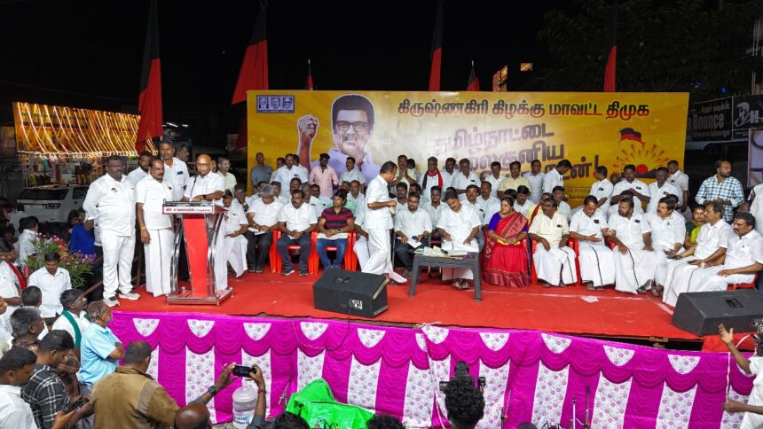 கிருஷ்ணகிரி கிழக்கு மாவட்ட திமுக சார்பில் ஊத்தங்கரை நான்கு முனை சந்திப்பில் மாபெரும் பொதுக்கூட்டம் கிருஷ்ணகிரி கிழக்கு மாவட்ட செயலாளரும் பர்கூர் சட்டமன்ற உறுப்பினருமான தே.மதியழகன் எம்எல்ஏ தலைமையில் நடைபெற்றது. நிகழ்ச்சியில் சிறப்பு அழைப்பாளராக செய்தி தொடர்பு மாநில துணை செயலாளர் சூர்யா கிருஷ்ணமூர்த்தி கலந்து கொண்டு சிறப்புரையாற்றினார். ஒன்றிய செயலாளர்கள் எக்கூர் செல்வம், ரஜினி செல்வம், மூன்றம்பட்டி குமரேசன், நரசிம்மன், குணவசந்தரசு, சாந்தமூர்த்தி, ராஜேந்திரன், மகேந்திரன், அறிஞர், தேங்காய் சுப்பிரமணி, சரவணன், பேருராட்சி தலைவர்கள் அமானுல்லா, தம்பிதுரை ஆகியோர் முன்னிலையில் மாவட்டவைத் தலைவர் நாகராஜ், மாவட்ட பொருளாளர் கதிரவன், மாவட்ட பொறியாளர் அணி காந்தி, மாவட்ட விவசாய அணி அமைப்பாளர் இளையராஜா, மாவட்ட விவசாய அணி துணை அமைப்பாளர் காமராஜ், மாநில மகளிர் அணி பிரச்சார குழு செயலாளர் மாலதி நாராயணசாமி, மாவட்ட துணை செயலாளர் ஆசிரியர் சந்திரன், கடலரசு மூர்த்தி, முன்னாள் எம்.பி வெற்றிச்செல்வன், மாநில வர்த்தக அணி துணை செயலாளர் அன்பரசு, மாவட்ட நெசவாளர் அணி அமைப்பாளர் அம்மன் ராஜா, பேரூராட்சி கவுன்சிலர்கள் சுமித்ரா தவமணி, கணகேஸ்வரி, சிவன், கதிர்வேல் ஸ்ரீராம், மாவட்ட மகளிரணி துணை அமைப்பாளர்கள் சின்னத்தாய், மணிமொழி, ஒன்றிய துணை செயலாளர்கள் ஜெயச்சந்திர பாண்டியன், சென்னைய செட்டி உள்ளிட்ட ஏராளமான கழக நிர்வாகிகள், பொதுமக்கள் கலந்து கொண்டனர். நிகழ்ச்சி நிறைவாக ஊத்தங்கரை பேரூர் கழக செயலாளர் தீபக் என்கிற பார்த்திபன் நன்றியுரை கூறினார்.