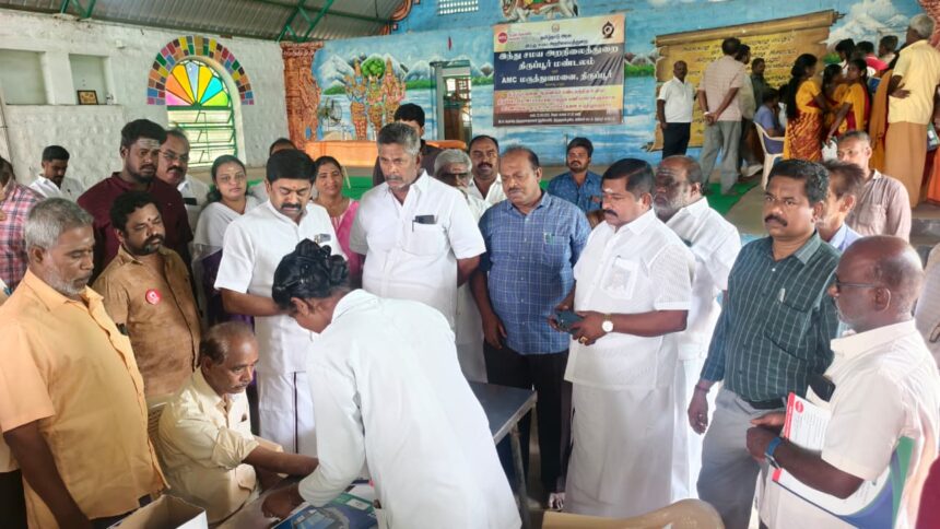 திருப்பூர் திருமுருகன் பூண்டியில் இந்து சமய அறநிலைத்துறை திருப்பூர் மண்டலம் மற்றும் ஏஎம்சி மருத்துவமனை இணைந்து நடத்திய திருப்பூர் இணை ஆணையர் மண்டலத்தில் உள்ள திருக்கோயில் அர்ச்சகர்கள் மற்றும் பணியாளர்களுக்கான கட்டணமில்லா முழு உடல் பரிசோதனை மருத்துவ முகாமை திருப்பூர் வடக்கு மாவட்ட கழக செயலாளர் மாநகராட்சி மேயர் தினேஷ்குமார் துவக்கி வைத்தார்.