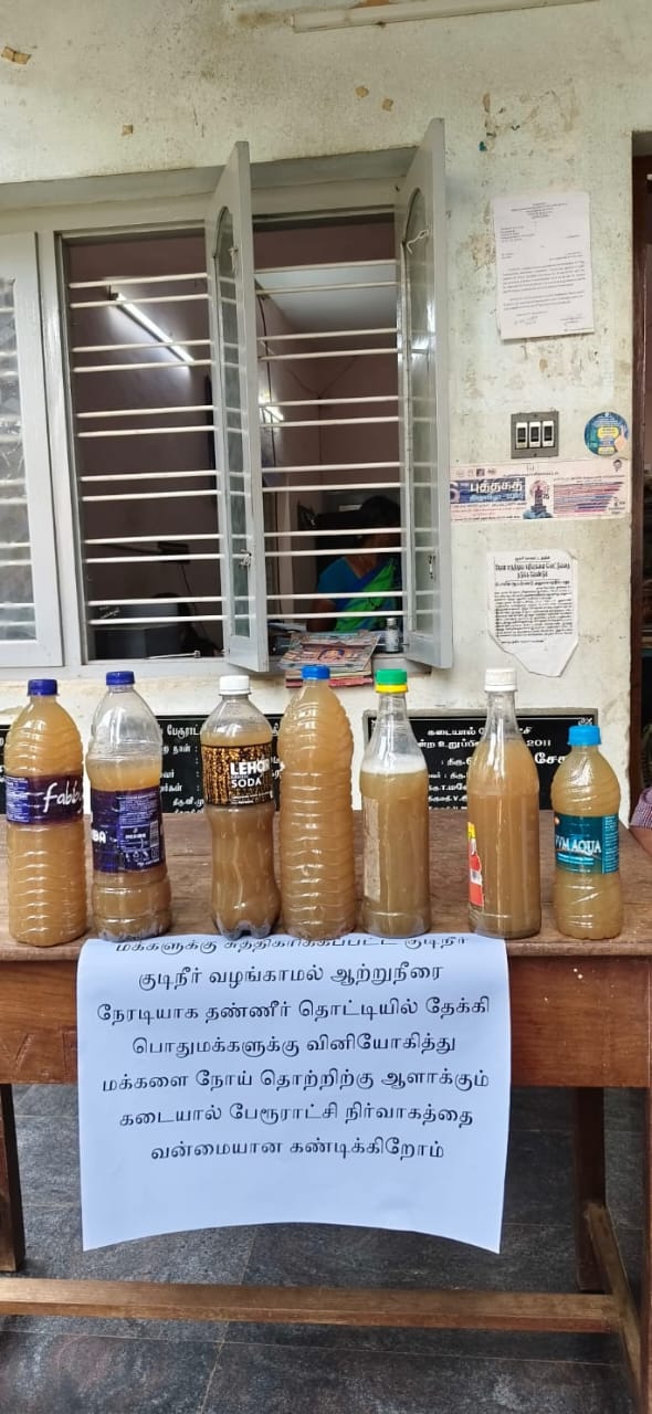 கடையால் பேரூராட்சி நிர்வாகத்தை கண்டித்து பொதுமக்கள் பேரூராட்சி அலுவலகத்தில் தங்களுக்கு விநியோகிக்கப்படும் நீரோடு திரண்டு வந்தனர். சுத்திகரிக்கப்பட்ட குடிநீர் வழங்க வேண்டும் என்ற கோரிக்கையை முன்வைத்தனர். கோரிக்கைகளை கேட்டறிந்த செயல் அலுவலர் மாதத்திற்கு இருமுறை நீர் தேக்க தொட்டியை சுத்தம் செய்து அருகில் இருக்கும் பொதுமக்களிடம் கையெழுத்து பெற வேண்டும் என நடவடிக்கை எடுத்துள்ளார்.