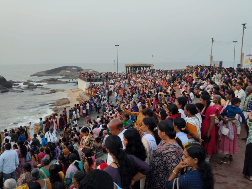 அதனைத்தொடர்ந்து கன்னியாகுமரி முக்கடல் சங்கமத்தில் புனித நீராடி பகவதி அம்மன் கோவிலில் சாமி தரிசனம் செய்தனர்.
