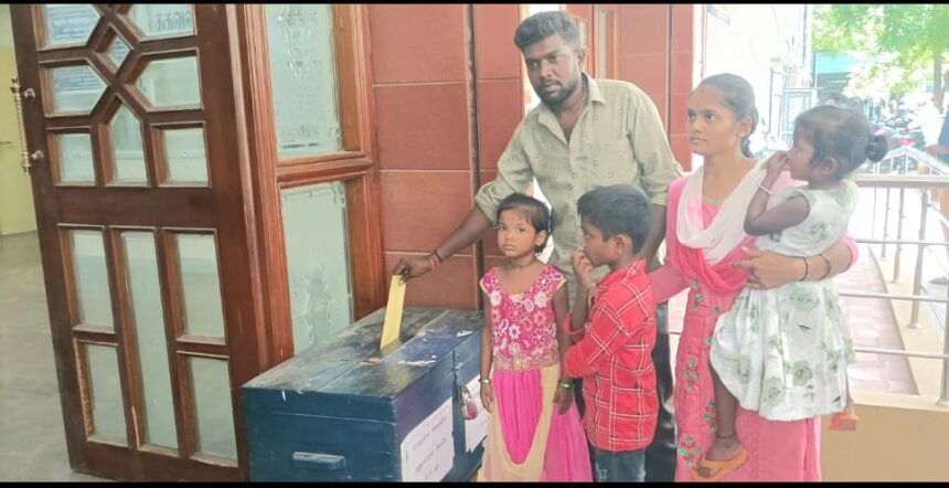 வேலூர் மாவட்டம், பேரணாம்பட்டு தாலுகா, பேரணாம்பட்டு காவல் நிலையம் பின்புறம், முருகன் கோவில் தெரு, பகுதியைசேர்ந்த கணபதி த/பெ.ஆறுமுகம் நான் மேற்கண்ட முகவரியில் வசித்து வருகிறேன் நான் வன்னியர் வகுப்பை சார்ந்தவர் எனது மனைவி தில்ஷாத் முஸ்லிம் வகுப்பைச் சார்ந்தவர் நாங்கள் இருவீட்டாரின் எதிர்ப்பை மீறி நாங்கள் திருமணம் செய்து கொண்டு ஒற்றுமையோடு வாழ்ந்து வருகிறோம். எங்கள் இரு வீட்டாரின் உறவினர்கள் எங்களை ஒதுக்கி வைத்துள்ளார்கள் ஆனால் எங்களுக்கு இரண்டு பெண் மற்றும் ஒரு ஆண் குழந்தை என மூன்று குழந்தைகள் உள்ளனர். நாங்கள் பதிவு திருமணம் செய்ய முடியவில்லை ஆகையால் நான் தனியார் வாகனங்களில் ஓட்டுநராக பணியாற்றி வருகிறேன் என் குடும்ப சூழ்நிலை கருதி நான் வறுமை கோட்டுக்கு கீழ் வாழ்ந்து வருகிறேன் ஆகையால் மாவட்ட ஆட்சியர் சுப்புலட்சுமி அவர்கள் கருணை மனம் கொண்டு என்னுடைய மனுவை பரிசீலனை செய்து என் வாழ்வாதாரத்துக்கு வழி காட்ட வேண்டும் என்று வட்டாட்சியருக்கு கோரிக்கை மனு கொடுத்துள்ளார் இவ்வாறு மனு அளித்துள்ளார் என்பது குறிப்பிடத்தக்கது.