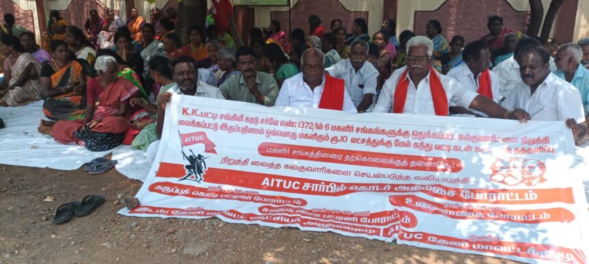 கல்குவாரியை மீண்டும் செயல்படுவதற்காக உரிமத்தை மகளிர் சுய உதவி குழுவிற்கு வழங்க மாவட்ட நிர்வாகம் நடவடிக்கை எடுக்க வேண்டும் என கோரிக்கையை வலியுறுத்தி மகளிர் சுய உதவிக் குழு பெண்கள் மற்றும் ஏஐடியூசி தொழிலாளர்கள் கலந்து கொண்டு போராட்டத்தில் ஈடுபட்டு வருகின்றனர்.