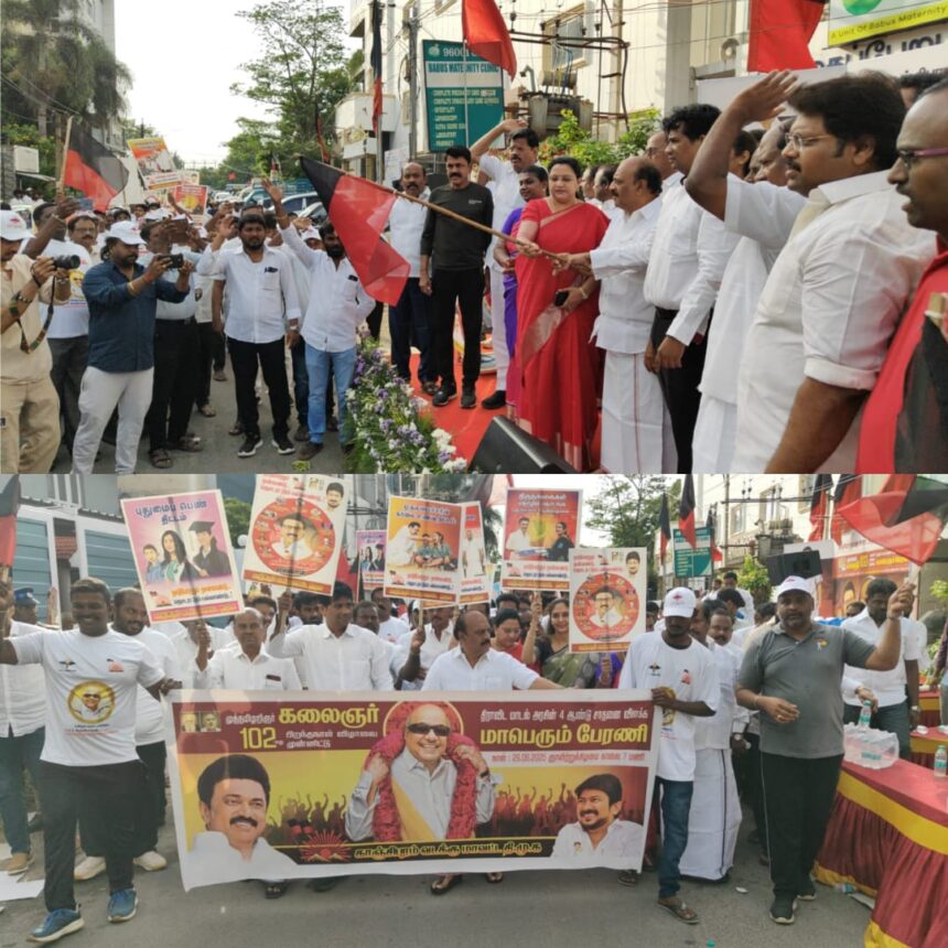 காஞ்சிபுரம் வடக்கு மாவட்ட திமுக மருத்துவர் அணி சார்பாக முத்தமிழறிஞர் கலைஞர் அவர்களின் 102-வது பிறந்தநாளை முன்னிட்டு தாம்பரத்தில் 1.02 கி.மீ. க்கு கழக அரசின் நான்காண்டு சாதனை விளக்க மாபெரும் பேரணி நடைபெற்றது. இதில் அமைச்சர் தா.மோ. அன்பரசன் அவர்கள் கொடி அசைத்து துவக்கி வைத்து பின்னர் பேரணியில் கலந்து கொண்டனர்.