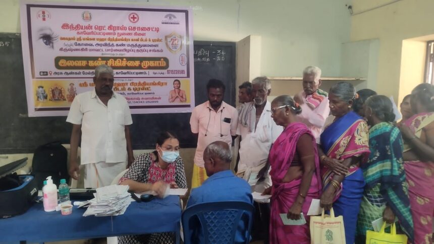 கிருஷ்ணகிரி மாவட்டம் காவேரிப்பட்டினம் அரசு ஆண்கள் மேல்நிலைப் பணியில் இந்தியன் ரெட் கிராஸ் சொசைட்டி மற்றும் ஜெகதாப் ஸ்ரீ மங்கள மஹா பிரத்தியங்கிரா காளி பீடம் டிரஸ்ட், கோவை அரவிந்த் கண் மருத்துவமனை இணைந்து நடத்தும் மாபெரும் இலவச கண் சிகிச்சை முகாம் ஜெகதாப் சக்தி ஸ்ரீ பிரகாஷ் சுவாமிகள் ஏற்பாட்டில் ரெட் கிராஸ் மாவட்டச் செயலாளர் செந்தில்குமார், திருவள்ளுவர் பத்திரிகையாளர்கள் சங்க கிருஷ்ணகிரி மாவட்டத் தலைவர் எஸ். மதியழகன் ஆகியோர் முன்னிலையில் முகாமினை தலைமை செயற்குழு உறுப்பினர் ஜெ.கே. கிருபாகரன் கலந்துகொண்டு குத்துவிளக்கு ஏற்றி துவக்கி வைத்தார். இதைத்தொடர்ந்து கோவை அரவிந்த் கண் மருத்துவமனை மருத்துவர் எஸ்.என்.நிஷி தலைமையில் மருத்துவக் குழுவினர் பொது மக்களை பரிசோதித்து கண் புரை அறுவை சிகிச்சைக்கு தேர்ந்தெடுக்கப்பட்ட நபர்களை கோவை அரவிந்த் கண் மருத்துவமனைக்கு அனுப்பி வைத்தனர். இதில் நூற்றுக்கும் மேற்பட்ட பொதுமக்கள் கலந்து கொண்டு பயன் அடைந்தனர்.