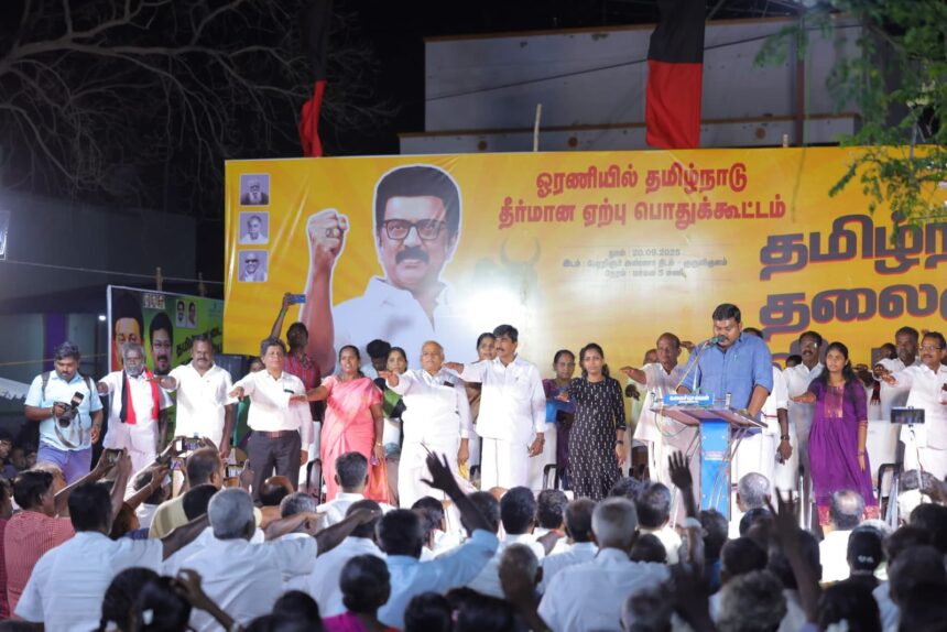 தென்காசி வடக்கு மாவட்ட தி.மு.க சார்பில் தமிழ்நாட்டை தலைகுனிய விடமாட்டேன் ‘ஓரணியில் தமிழ்நாடு’ தீர்மானம் ஏற்பு பொதுக்கூட்டம் குருவிகுளம் பேரறிஞர் அண்ணா திடலில் தென்காசி வடக்கு மாவட்ட செயலாளர் ராஜா எம்.எல்.ஏ தலைமையில் நடந்தது. தலைமைச் செயற்குழு உறுப்பினர்கள் முன்னாள் அமைச்சர் தங்கவேலு, யூஎஸ்டி சீனிவாசன், பரமகுரு, மாநில மருத்துவர் அணி துணைசெயலாளர் செண்பக விநாயகம், மாநில வர்த்தகர் அணி இணைச் செயலாளர் முத்துச்செல்வி, மாவட்ட அவைத்தலைவர் சுப்பையா, மாவட்ட பொருளாளர் சரவணன், துணை செயலாளர்கள் மனோகரன், ராஜதுரை, புனிதா முன்னிலை வகித்தனர். குருவிகுளம் தெற்கு ஒன்றிய செயலாளர் கடற்கரை வரவேற்றார். மாவட்ட வக்கீல் அணி துணை அமைப்பாளர் பிரபாகரன் தொகுத்து வழங்கினார். தொடர்ந்து தென்காசி வடக்கு மாவட்ட செயலாளர் ராஜா எம்எல்ஏ தலைமையில் ஓரணியில் தமிழ்நாடு தீர்மானம் ஏற்பு உறுதிமொழி ஏற்கப்பட்டது.
