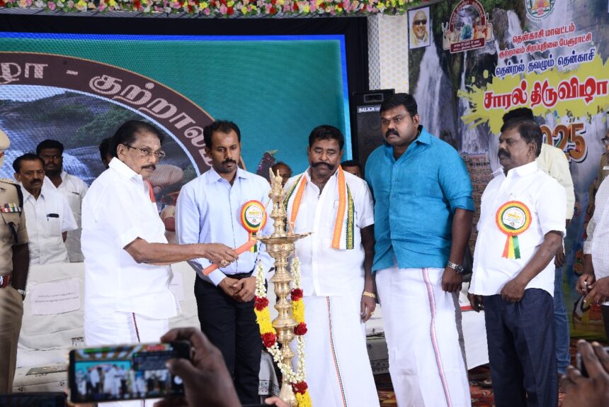 தென்காசி மாவட்டம் குற்றாலத்தில் சாரல் திருவிழாவை வருவாய் மற்றும் பேரிடர் மேலாண்மை துறை அமைச்சர் கே.கே.எஸ்.எஸ்.ஆர். ராமச்சந்திரன் குத்து விளக்கேற்றி துவக்கி வைத்தார். சாரல் திருவிழா துவக்க விழாவில் தென்காசி மாவட்ட ஆட்சியர் கமல் கிஷோர், தென்காசி சட்டமன்ற உறுப்பினர் பழனி நாடார், வாசுதேவநல்லூர் சட்டமன்ற உறுப்பினர் சதன் திருமலைகுமார், சங்கரன்கோவில் சட்டமன்ற உறுப்பினர் ராஜா, மாவட்ட வருவாய் அலுவலர் ஜெயச்சந்திரன், தென்காசி தெற்கு மாவட்ட திமுக பொறுப்பாளர் ஜெயபாலன் மற்றும் அரசு அதிகாரிகள் கலந்து கொண்டனர்.