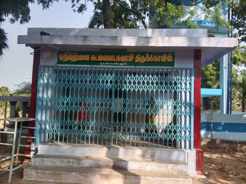 சுசீந்திரம் அருகே உள்ள குலசேகரன் புதூர் லட்சுமிபுரம் பகுதியில் ஒற்றைப்பனை சுடலைமாட சுவாமி கோவில் ஒன்று உள்ளது. இந்த கோவில் தங்க முத்து என்பவருக்கு சொந்தமான குடும்ப கோவில் இன்று காலை தங்கமுத்து கோவிலுக்கு சாமி கும்பிட சென்று பார்க்கும் பொழுது கோவிலின் முன்பக்க கிரில் கதவில் போடப்பட்டிருந்த பூட்டு உடைக்கப்பட்டு கிடந்தது. அதிர்ச்சி அடைந்த தங்கமுத்து சுசீந்திரம் காவல் நிலையத்திற்கு சென்று புகார் அளித்தார்.