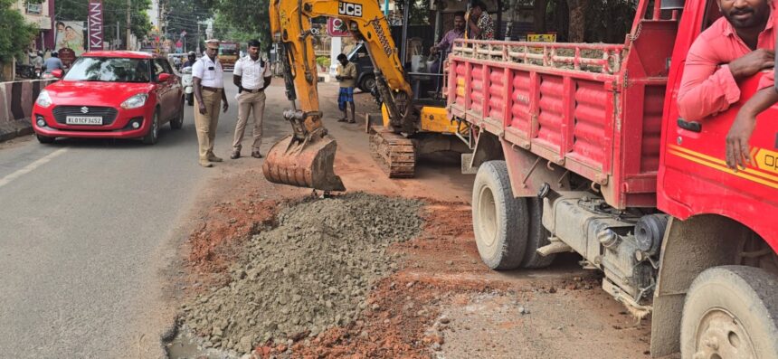 Reading: சாலையில் பள்ளம்; களத்தில் இறங்கி சீரமைத்த போக்குவரத்து உதவி ஆய்வாளர்கள்