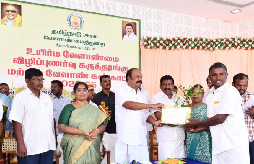 சிவகங்கை மாவட்டம் காரைக்குடி அமராவதிபுதூர் கிராமிய பயிற்சி மையத்தில் நடைபெற்ற உயிர்ம வேளாண்மை விழிப்புணர்வு கருத்தரங்கு மற்றும் வேளாண் கண்காட்சியினை கூட்டுறவுத்துறை அமைச்சர் கே.ஆர். பெரிய கருப்பன் தொடங்கி வைத்து மலைக்கலை மற்றும் மலைப்பயிர்கள் துறையின் சார்பில் பழச்செடி தொகுப்புகளை விவசாயிகளுக்கு வழங்கினார். உடன் மாவட்ட ஆட்சியர் கா. பொற்கொடி, காரைக்குடி சட்டமன்ற உறுப்பினர் எஸ். மாங்குடி உட்பட பலர் கலந்து கொண்டனர்.