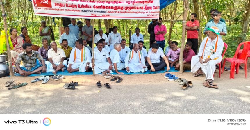 குலசேகரம் அருகே சுருளகோட்டில் தனியார் ரப்பர் பால் நிறுவனம் ஒன்று உள்ளது. இந்த நிறுவனத்தில் வேலை செய்யும் தொழிலாளர்களுக்கு கடந்த 2 ஆண்டுகளாக ஊதிய உயர்வு மற்றும் சலுகைகள் மறுக்கப்பட்டு வருவதை தொடர்ந்து கடந்த 43 நாட்களாக தொடர் வேலை நிறுத்த போராட்டம் நடக்கிறது. இது தொடர்பாக தொழிலாளர் துறை பேச்சு வார்த்தை நடத்தியும் தீர்வு ஏற்படவில்லை.