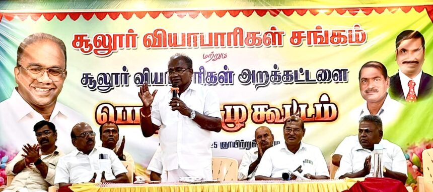 கோவை மாவட்டம் சூலூர் வியாபாரிகள் அறக்கட்டளை வியாபாரிகள் சங்கத்தின் பொதுக்குழு கூட்டம் சங்கத்தின் அறக்கட்டளை அரங்கத்தில் நடைபெற்றது. பொதுக்குழுவில் சங்கத்தின் தலைவர் சந்திரசேகரன் தலைமையில் சுப்பிரமணியம், துணைத் தலைவர்கள் செல்வராஜ், இளங்கோவன், தங்கராஜ், சசிகுமார், செயலாளர்கள் முருகேசன், உமரி கணேஷ், முத்துச்சாமி ஆகியோர் முன்னிலையில் வெகு சிறப்பாக நடைபெற்றது. இதில் நூற்றுக்கும் மேற்பட்டோர் கலந்து கொண்டு பொதுக்குழுவில் பல்வேறு தீர்மானங்கள் நிறைவேற்றப்பட்டன.