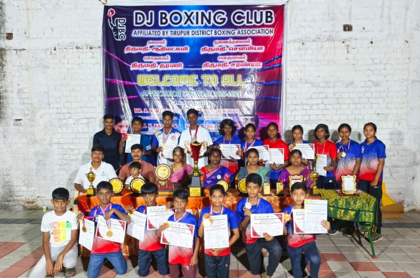 திருப்பூர் மாவட்ட குத்து சண்டை கழகத்தில் டி.ஜே பாக்ஸிங் கிளப் பதிவு செய்யப்பட்ட நிகழ்வு மற்றும் தேசிய, மாநில அளவிலான பல்வேறு பிரிவுகளில் பங்கேற்று போட்டியில் வெற்றி பெற்ற குழந்தை செல்வங்களுக்கு பாராட்டு சான்றிதழ் மற்றும் பதக்கங்களும் கோப்பைகள் வழங்கும் விழா ரங்கநாதபுரத்தில் உள்ள தனியார் பள்ளியில் நடைபெற்றது.