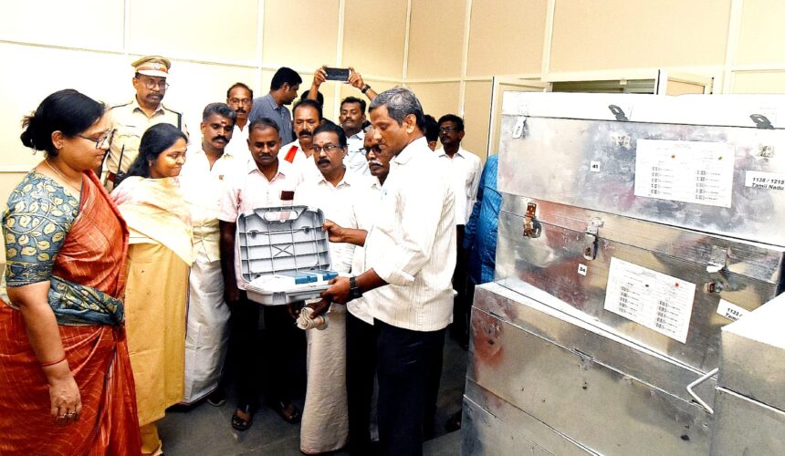 தஞ்சாவூரில் மின்னணு வாக்குப் பதிவு எந்திரங்கள் பாதுகாப்பு வைப்பு அறையில் மாநில தலைமை தேர்தல் அதிகாரி அர்ச்சனா பட்நாயக் தலைமையில் ஆய்வு செய்யப்பட்டது.