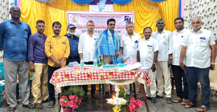 தமிழ்நாடு காது கேளாதோர் கூட்டமைப்பின் 2025-2028 ஆம் ஆண்டிற்கான புதிய நிர்வாகிகள் பதவி ஏற்பு விழா மற்றும் உறுதிமொழி ஏற்பு விழா வேலூர் பில்டர்பெட் ரோட்டில் உள்ள ஆசிரியர் இல்ல கலையரங்கில் நடைபெற்றது. விழாவிற்கு வேலூர் மாவட்ட காது கேளாதோர் சங்கத் தலைவர் கலைச்செல்வன் தலைமை தாங்கினார். பொதுச் செயலாளர் சுரேஷ் குமார் வரவேற்றார். சிறப்பு அழைப்பாளர்களாக வேலூர் மாவட்ட மாற்றுத்திறனாளிகள் நல அலுவலர் திரு.சரவணன், தமிழ்நாடு காது கேளாதோர் கூட்டமைப்பின் துணை சேர்மன் பிரகாஷ் ஆகியோர் கலந்து கொண்டனர். இதில் மாநிலத் தலைவராக R.பழனிசாமி, துணைத் தலைவராக சிக்கந்தர் மற்றும் பொதுச் செயலாளராக G ஜெய்சங்கர், பொருளாளராக டென்சிங் மற்றும் மாநிலம் முழுவதும் உள்ள பல்வேறு மாவட்டங்களில் இருந்து ஒருவர் செயற்குழு உறுப்பினராகவும் பதவி ஏற்றுக் கொண்டனர். இக்கூட்டத்தில் அரசு வேலைவாய்ப்பு 4% இட ஒதுக்கீட்டின்படி வேலை வழங்குவது உள்ளிட்ட 5 அம்ச தீர்மானங்கள் நிறைவேற்றப்பட்டது. நிகழ்ச்சியின் நிறைவாக வேலூர் மாவட்ட காது கேளாதோர் சங்க செயற்குழு உறுப்பினர் ராஜ்குமார் நன்றியுரையாற்றினார்.