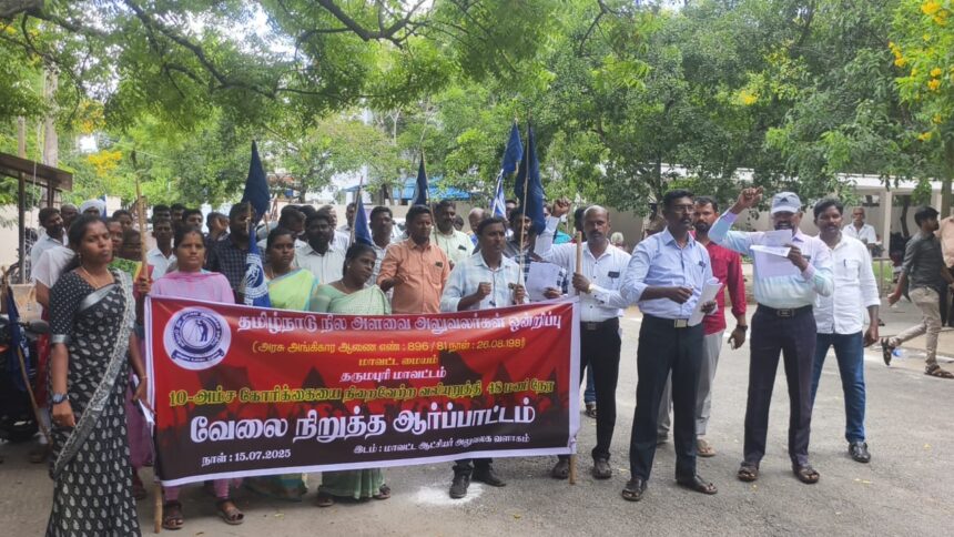 தருமபுரியில் தமிழ்நாடு நிலஅளவை அலுவலர்கள் ஒன்றிப்பு சார்பில் தருமபுரி மாவட்ட ஆட்சியர் அலுவலகம் முன்பு 48 மணிநேர வேலை நிறுத்த ஆர்ப்பாட்டம் நடைபெற்றது. களப்பணியாளர்களின் பணிச்சுமையை குறைக்க வேண்டும். தரம் இறக்கப்பட்ட குறுவட்ட அளவர் பதவியை மீண்டும் வழங்க வேண்டும். நில அளவைத் துறையில் உள்ள காலிப் பணியிடங்களை நிரப்ப வேண்டும். துணை ஆய்வாளர், ஆய்வாளர்கள் ஊதிய முரண்பாட்டை கலைந்திட வேண்டும். ஒப்பந்த முறையில் நில அளவர் நியமனத்தை கைவிட வேண்டும். புற ஆதார ஒப்பந்த முறையில் புல உதவியாளர் நியமனத்தை கைவிடவேண்டும். உயர் அலுவலர்களின் அதிகாரங்களை பறிக்கும் நடவடிக்கையை கைவிடவேண்டும். நீதிமன்ற நடைமுறை பயிற்சியை வழங்க வேண்டும். புதிதாக தோற்றுவிக்கப்பட்டுள்ள நகராட்சிகளுக்கு நகர சார் ஆய்வாளர் பணியிடங்களை வழங்க வேண்டும். ஒப்படைக்கப்பட்ட சார் ஆய்வாளர் பணியிடங்களை மீள வழங்க வேண்டும் உள்ளிட்ட 10 அம்ச கோரிக்கைகளை வலியுறுத்தி 48 மணி நேர வேலை நிறுத்த ஆர்ப்பாட்டம் நடைபெற்றது.