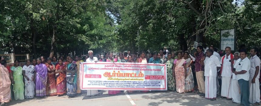 தூய்மை பணி செய்ய உபகரணங்கள் வழங்க வேண்டியும், தமிழ்நாடு அரசு ஆணைப்படி ரூ. 6,000+6503(DA)= 21,503 சம்பளம் வழங்கவும், 11 ஆண்டுகளாக பணி செய்யும் அனைவரையும் நிரந்தரம் செய்ய வேண்டி, ஆர்ப்பாட்டத்தில் ஈடுபட்டனர்.
