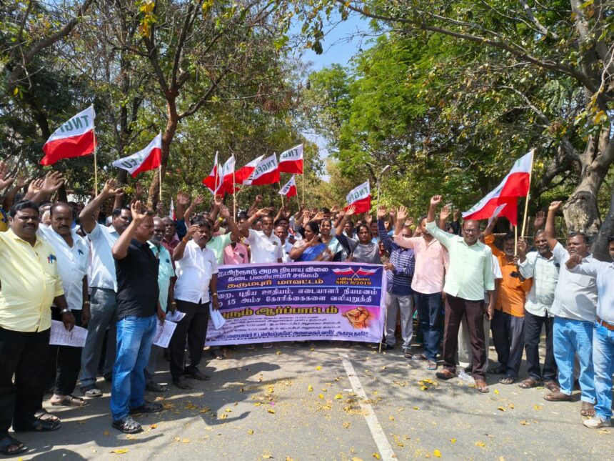 தருமபுரி மாவட்ட தமிழ்நாடு அரசு நியாய விலை கடை பணியாளர்கள் சங்கத்தின் சார்பில் 15 அம்ச கோரிக்கைகளை நிறைவேற்ற வலியுறுத்தி மாவட்ட ஆட்சித் தலைவர் அலுவலகம் அருகில் மாவட்ட தலைவர் கோவிந்தராஜ் தலைமையில் கண்டன ஆர்ப்பாட்டம் நடைபெற்றது.