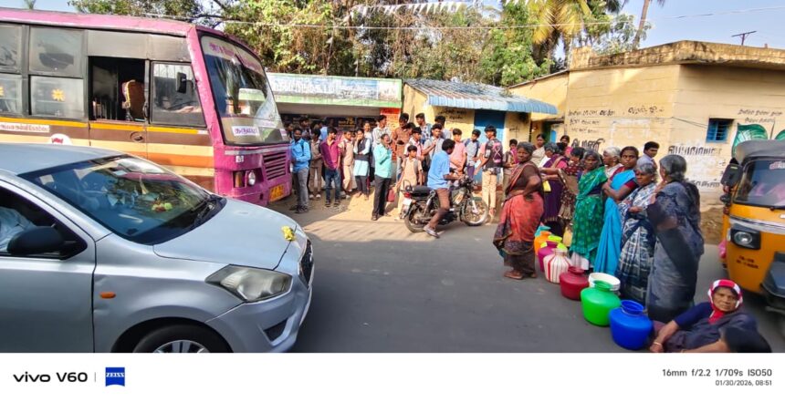 இந்த நிலையில் சாலை பணி தொடங்கியதிலிருந்து வெங்கட்டம்பட்டி கிராமத்தில் ஒரு சில பகுதிகளுக்கு குடிநீர் விநியோகம் செய்யப்படவில்லை. இதனால் அருகில் உள்ள கிராமங்களுக்கு சென்று குடிநீர் எடுத்து வந்து பயன்படுத்தி வந்தனர். குடிநீர் குழாய்களை சீரமைத்து முறையாக குடிநீர் விநியோகம் செய்ய வேண்டும் என கிராம மக்கள் பலமுறை முறையிட்டனர். ஊராட்சி நிர்வாகம் உரிய நடவடிக்கை எடுக்காததால், ஆத்திரமடைந்த கிராம மக்கள் காலி குடங்களுடன் வெங்கட்டம்பட்டி – தருமபுரி சாலையில் அமர்ந்து, சாலை மறியலில் ஈடுபட்டனர்.