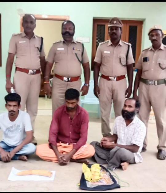 திண்டுக்கல் மாவட்டம் தாண்டிக்குடி மலைப்பகுதியை சேர்ந்த சிலர் யானை தந்தத்தை விற்பனை செய்ய முற்படுவதாக வத்தலகுண்டு வனத்துறையினருக்கு கிடைத்த தகவலையடுத்து வத்தலகுண்டு வனத்துறை வனசரகர் காசிலிங்கம், தாண்டிக்குடி பிரிவு வனவர் முத்துக்குமார், வத்தலகுண்டு வனவர் ரமேஷ் மற்றும் வனத்துறை தனிப்படை பிரிவினர் வியாபாரி போல் பேசி தாண்டிக்குடி அடுத்த மங்களம் கொம்பையைச் சேர்ந்த சுருளிவேல் (38), பண்ணைக்காடு ராதாகிருஷ்ணன் (44) தாண்டிக்குடி பட்லங்காடு பாஸ்கரன் (42) ஆகிய 3 பேரை கைது செய்து, அவர்களிடமிருந்த யானைத் தந்தத்தை பறிமுதல் செய்து அந்த தந்தத்தை யாரிடமாவது வாங்கினார்கள்? அல்லது யானையை கொன்று தந்தத்தை எடுத்தார்களா? என்ற கோணத்தில் விசாரணை மேற்கொண்டு வருகின்றனர்.