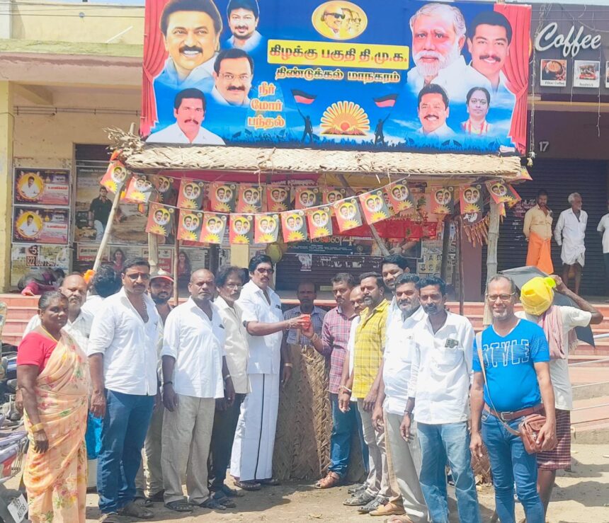 திண்டுக்கல் மாநகர கிழக்கு பகுதி தி.மு.க. சார்பில் நீர், மோர் பந்தல் திறக்கப்பட்டு பொதுமக்களுக்கு வழங்கப்பட்டது.