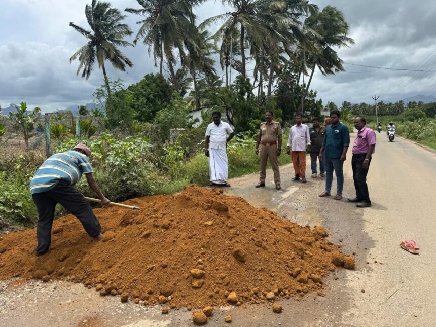 Reading: தினந்தோறும் விபத்துகள் ஏற்பட்ட குண்டும் குழியுமான சாலை தற்காலிகமாக சரி செய்யப்பட்டது