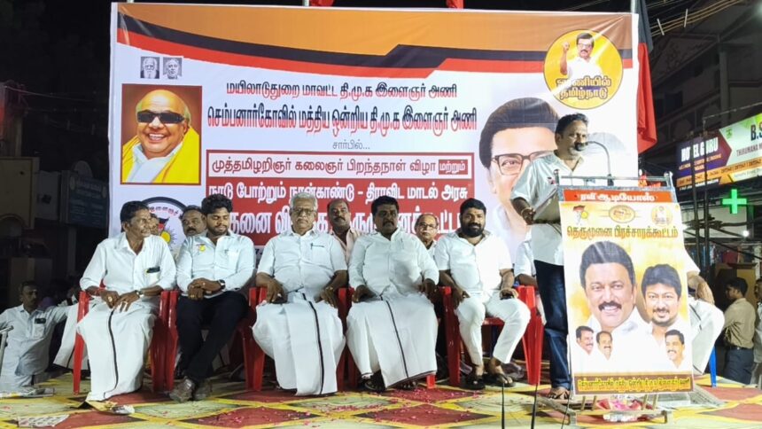 முத்தமிழ் அறிஞர் கலைஞரின் பிறந்த நாள் விழா மற்றும் திராவிட மாடல் அரசின் நான்காண்டு சாதனை விளக்க தெருமுனைப் பிரச்சார கூட்டம் திருக்கடையூர் கடை வீதியில் செம்பனார்கோவில் மத்திய ஒன்றிய இளைஞரணி சார்பில் செம்பை மத்திய ஒன்றிய செயலாளர் பி.எம். அன்பழகன் தலைமையில் நடைபெற்றது. இந்த கூட்டத்தில் சிறப்பு அழைப்பாளராக மயிலாடுதுறை மாவட்ட செயலாளர் நிவேதா எம். முருகன், தலைமை கழக பேச்சாளர் நாகராஜன், அருள்தாஸ், குமரவேல் ஆகியோர் அரசின் சாதனைகளை பட்டியலிட்டு பேசினர்.