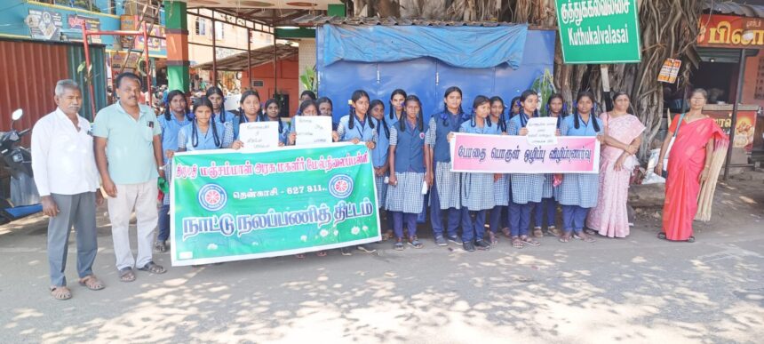 இதே போல தென்காசி குத்துக்கல் வலசை அருகில் மஞ்சம்மாள் அரசு மகளிர் மேல்நிலைப் பள்ளி என்.எஸ்.எஸ் சார்பில் போதை பொருட்கள் தடுப்பு குறித்த விழிப்புணர்வு பேரணி நடந்தது. அப்போது போதை பொருட்களால் ஏற்படும் தீமைகள் குறித்த விழிப்புணர்வு துண்டு பிரசுரங்களை பொதுமக்களுக்கு வழங்கினர். இதில் ஏராளமான மாணவிகள் கலந்து கொண்டனர்.