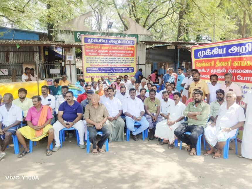 புளியங்குடி நகராட்சி மற்றும் பாளையங்கோட்டை மாநகராட்சிக்கு பாத்தியப்பட்ட காய்கனி சந்தையில் உள்ள காய்கனி வியாபாரிகளுக்கு இது போன்ற சூழ்நிலையில் பழைய மார்க்கெட் கடைகளை இடித்து புதிய மார்க்கெட்டில் உள்ள கடைகளை ஏற்கனவே வியாபாரம் செய்து வந்த காய்கனி வியாபாரிகளுக்கே புளியங்குடி நகராட்சி பாளையங்கோட்டை மாநகராட்சி நிர்வாகம் கொடுத்துள்ளது. 01.10.2025 ம் தேதி தென்காசி நகராட்சியில் இருந்து ஏலம் மற்றும் ஒப்பந்தப்புள்ளி அறிவிப்பு என்ற நோட்டீஸ் பத்திரிக்கை செய்தி தாளில் வெளியிடப்பட்டுள்ளது. இதனால் சிறு வியாபாரிகளாகிய எங்களுக்கு பெரும் பணக்காரர்களிடம் போட்டியிடும் சூழ்நிலையும் அதனால் எங்கள் வாழ்வாதாரத்தை இழந்து தொழில் நடத்துவதற்கு கடைகள் கிடைக்காத சூழ்நிலையும் ஏற்படும் என்கின்ற அச்சத்தில் வியாபாரிகள் அனைவரும் உள்ளோம். இதனால் சிறு வியாபாரிகளாகிய நாங்கள் வேறு வழியின்றி பொது ஏலம் ரத்து செய்யும் வரை எங்கள் கடைகளை 07.10.2025ம் தேதியில் இருந்து கால வரையரையற்ற கடை அடைப்பு போராட்டம் நடத்துகிறோம்.