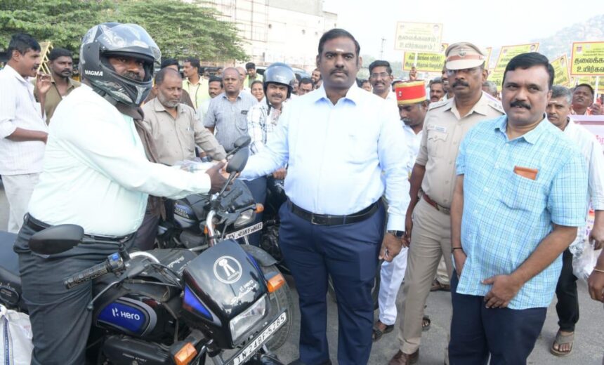 தொடர்ந்து, மாவட்ட ஆட்சித்தலைவர், இருசக்கர வாகனங்களில் தலைகவசம் அணிந்து வந்தவர்களுக்கு பரிசுகள் வழங்கி பாராட்டுக்களை தெரிவித்தார். மேலும், தலைகவசம் அணிந்து வராத இருசக்கர வாகன ஓட்டிகளுக்கு புதிய தலைகவசங்களை வழங்கி இனிவரும் காலங்களில் தலைக்கவசம் அணிந்து வாகனங்களை ஓட்ட வேண்டும் என அறிவுரை வழங்கினார்.