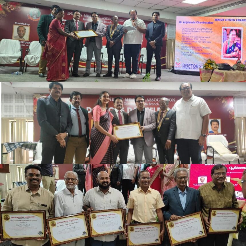 இந்திய மருத்துவ சங்க விருது வழங்கும் விழாவில் தமிழகத்தில் மருத்துவத்துறையில் மகத்தான பணியாற்றிய தாராபுரத்தை சேர்ந்த டாக்டர் லோகநாயகி, டாக்டர் பிரபு, டாக்டர் சத்யா, கோபிசெட்டிபாளையம் டாக்டர் குமரேசன், குடியாத்தம் டாக்டர் சுதாகர், டாக்டர் கிருத்திகாதேவி உள்ளிட்ட 100 மருத்துவர்களுக்கு மூத்த குடிமக்கள், சிறந்த மருத்துவர், சிறப்பான சேவை செய்தவர்கள் என பல்வேறு பிரிவுகளில் விருதுகள் வழங்கப்பட்டது. தமிழகம் முழுவதிலுமிருந்து பல மருத்துவர்கள் அவரது குடும்பத்தினரோடு கலந்து கொண்டு விருதுகளை பெற்றுக் கொண்டனர்.