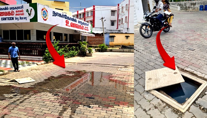 நாகர்கோவில் மாநகராட்சி அலுவலக வளாகத்தில் உள்ள உணவகத்தின் முன்பு கழிவுநீர் தொட்டியிலிருந்து கழிவுநீர் வெளியேறி துர்நாற்றம் வீசி சுகாதாரமற்று காணப்படுகிறது; கழிவுநீர் தொட்டியின் மூடிகள் உடைந்தும் திறந்தும் ஆபத்தான நிலையில் காணப்படுகிறது. இதனால் நோய் தொற்று பரவுவதுடன், விபத்துகளும் ஏற்படும் அபாயம் உள்ளது.