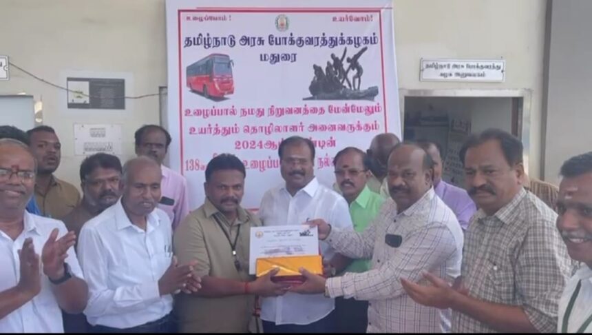 மதுரை பெரியார் பேருந்து நிலையத்தில் தமிழ்நாடு அரசு போக்குவரத்துக்கழகத்தின் சார்பில் மே 1 உழைப்பாளர் தினத்தை முன்னிட்டு மேலாண் இயக்குனர் ஆ.ஆறுமுகம் தலைமையில் ஒட்டுனர் மற்றும் நடத்துனர் முன்னிலையில் கேக் வெட்டி கொண்டாடப்பட்டது. மதுரை , திண்டுக்கல், விருதுநகர், தேனி மாவட்டங்களில் சிறப்பாக அதிகபடியான நாட்கள் பணிபுரிந்த ஒட்டுனர், நடத்துனர், தொழிலாளர்களுக்கு நற்சான்றிதழ் மற்றும் பரிசுகள் வழங்கப்பட்டது இந்த நிகழ்வில் பொது மேலாளர்கள் சமுத்திரம், ராகவன் மற்றும் போக்குவரத்து கழகபணியாளர்கள் , அலுவலர்கள் கலந்து கொண்டனர்.