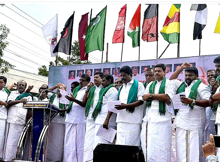 நெல்லின் ஈரப்பத அளவை உயர்த்தாத மத்திய அரசை கண்டித்து தஞ்சாவூரில் திமுக கூட்டணி கட்சியினர் ஆர்ப்பாட்டம்