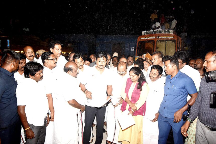 ஆய்வின்போது அமைச்சர்கள் அர.சக்கரபாணி (உணவு), டி ஆர் பி ராஜா (தொழில்) கோவி. செழியன் (உயர் கல்வி) மாவட்ட கலெக்டர் பிரியங்கா பங்கஜம், முரசொலி எம்பி, எம்எல்ஏக்கள் துரை. சந்திரசேகரன் அன்பழகன், டி.கே.ஜி. நீலமேகம், அண்ணாதுரை, அசோக்குமார், மேயர் சண் ராமநாதன், நுகர்பொருள் வாணிபக் கழக முதுநிலை மண்டல மேலாளர் செல்வம் மற்றும் அதிகாரிகள் உடன் இருந்தனர்.