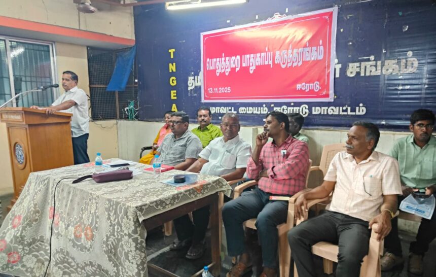 மத்திய மாநில அரசு ஊழியர், ஆசிரியர் மற்றும் மத்திய பொதுத்துறை ஊழியர் சங்கங்களின் ஒருங்கிணைப்பு குழு சார்பில் சிறப்பு கருத்தரங்கம் ஈரோடு தாலுகா அலுவலக வளாகத்தில் உள்ள சங்க அலுவலகத்தில் நடந்தது. தமிழ்நாடு அரசு ஊழியர் சங்க மாவட்ட செயலாளர் விஜய மனோகரன் தலைமையில் நடந்த இந்த கருத்தரங்கில் பிஎஸ்என்எல் ஊழியர் சங்க மாவட்ட செயலாளர் பாலு, டி ஆர் இ யு கோட்ட செயலாளர் முருகேசன், எல்ஐசி வடக்கு கிளை செயலாளர் தமிழரசு, ஆரம்ப பள்ளி ஆசிரியர் கூட்டணி மாவட்ட செயலாளர் சண்முகம், தபால் ஊழியர் சங்க கோட்ட செயலாளர் கோபிநாத், எல்ஐசி தெற்கு கிளை செயலாளர் சாந்தகுமார், பி இ எப் ஐ மாவட்ட செயலாளர் பூவேந்திரன், வருமான வரி ஊழியர் சம்மேளனம் சரக செயலாளர் மேபிள் குயினி பயஸ் மத்திய அரசு ஊழியர் ஒருங்கிணைப்பு குழு செயலாளர் ராமசாமி ஆகியோர் முன்னிலை வகித்தனர்.