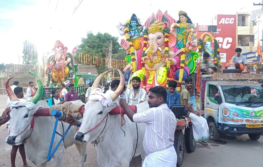 பரமக்குடியில் விநாயகர் சதுர்த்தி விழாவையொட்டி இந்து முன்னணி சார்பில் 32-ம் ஆண்டு விநாயகர் சிலை ஊர்வலம் நடைபெற்றது. பரமக்குடி நகராட்சியில் 60 கிராம பகுதிகளில் 20 விநாயகர் சிலைகள் உள்பட 80 இடங்களில் பிரதிஷ்டை செய்யப்பட்டு கணபதி ஹோமம் பழக்கப்பட்டு சிறப்பு வழிபாடுகள் நடைபெற்றது. பெண்களின் திரு விளக்கு வழிபாடு, உறியடி, வினாடி வினா, விளையாட்டு போட்டிகள் நடைபெற்றது. அன்னதானம் வழங்கப்பட்டது. நேற்று மாலை 5:00 மணிக்கு பரமக்குடி, எமனேஸ்வரத்தில் பிரதிஷ்டை செய்யப்பட்ட விநாயகர் சிலைகள் புறப்பட்டு சவுராஷ்டிரா மேல் நிலைப்பள்ளி அருகில் சென்றடைந்தது.