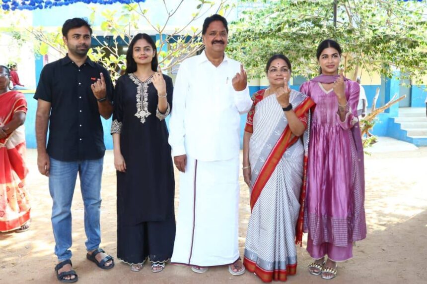பர்கூர் சட்டமன்றத் தொகுதி திமுக வேட்பாளர் தே.மதியழகன் குடும்பத்துடன் வந்து வாக்களித்தார்