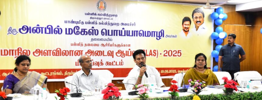 திருப்பத்தூர் மாவட்ட ஆட்சியர் அலுவலக கூட்டரங்கில் பள்ளி கல்வித்துறை சார்பில் பள்ளித் தலைமை ஆசிரியர்களுக்கான மாநில அளவிலான அடைவுத்தேர்வு 2025 (SLAS) குறித்த மீளாய்வுக் கூட்டம் மாண்புமிகு பள்ளிக் கல்வித்துறை அமைச்சர் அன்பில் மகேஸ் தலைமையில் மாவட்ட ஆட்சியர் க. சிவசௌந்திரவல்லி முன்னிலையில் பொய்யாமொழி நடைபெற்றது.