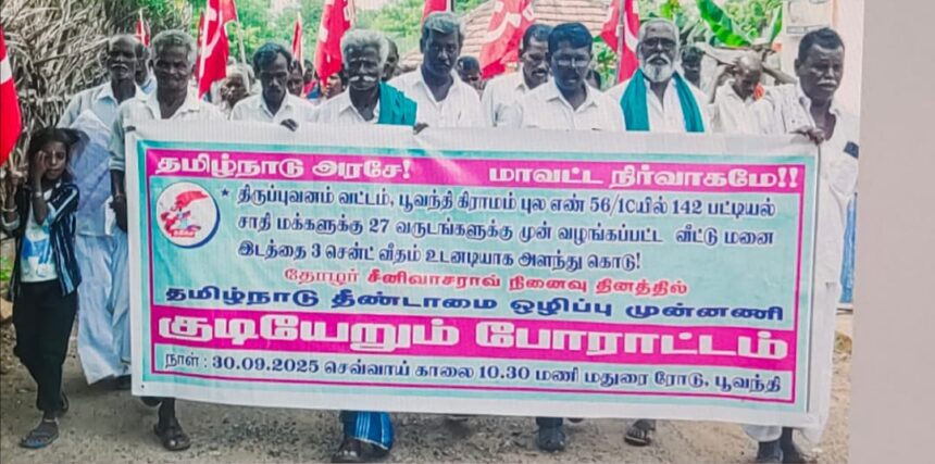 சிவகங்கை மாவட்டம் திருப்புவனம் வட்டம் பூவந்தி கிராமத்தில் கடந்த 27 ஆண்டுகளுக்கு தமிழ்நாடு அரசு முன்னதாக 142 ஆதி திராவிட பட்டியல் இன மக்களுக்கென ஒதுக்கித் தந்திட்ட புல எண் 56 ல் 1 C இடத்தை தலா 3 சென்ட் வீதம் அளவீடு செய்து ஒதுக்கித் தர கோரி ஆர்ப்பாட்டம் நடத்தினர்.