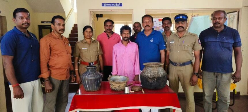 அப்போது அங்கு சந்தேகத்திற்கு இடமாக நின்றிருந்த ஒருவரை பிடித்து விசாரணை நடத்தினர். விசாரணையில் அவர் முன்னுக்கு பின் முரணாக பேசினார். தொடர்ந்து நடந்த விசாரணையில் அவர் கிள்ளிக்கோணம் பகுதியை சேர்ந்த தங்கப்பன் மகன் சதீஷ் (43) என்பதும், அவர் அப்பகுதியில் உள்ள மலையில் சாராயம் காய்ச்சுவதும் தெரியவந்தது. இதையடுத்து அவர் வைத்திருந்த 10 லிட்டர் சாராய ஊறல், பானை, ரப்பர் டியூப்புகள், குடம், கப், மரப்பலகை ஆகியவற்றை பறிமுதல் செய்தனர். பின்னர் அவரை நீதி மன்றத்தில் ஆஜர் படுத்தி சிறையில் அடைத்தனர்.