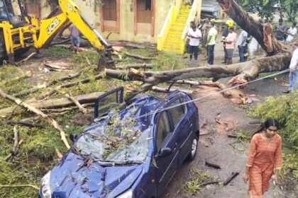 மரம் வேரோடு சாய்ந்ததில் கார் முற்றிலும் நாசம்